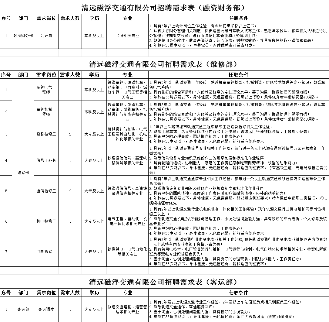 2、資料提交:應(yīng)聘人員下載填寫附件《清遠(yuǎn)磁浮交通有限公司招聘報(bào)名信息登記表》連同身份證、學(xué)歷證、職稱證、專業(yè)技術(shù)資格證等報(bào)名資料壓縮打包后發(fā)送至電子郵箱qycf_zp@163.com;郵件名稱請(qǐng)按“應(yīng)聘崗位+姓名+專業(yè)”格式命名。